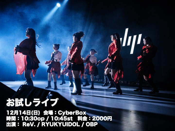 お試しライブ 2025年12月14日(日) 会場:CyberBox 時間:10:30op / 10:45st 料金:当日2000円(ご予約不要) 出演:ReV. / RYUKYUIDOL /OBP